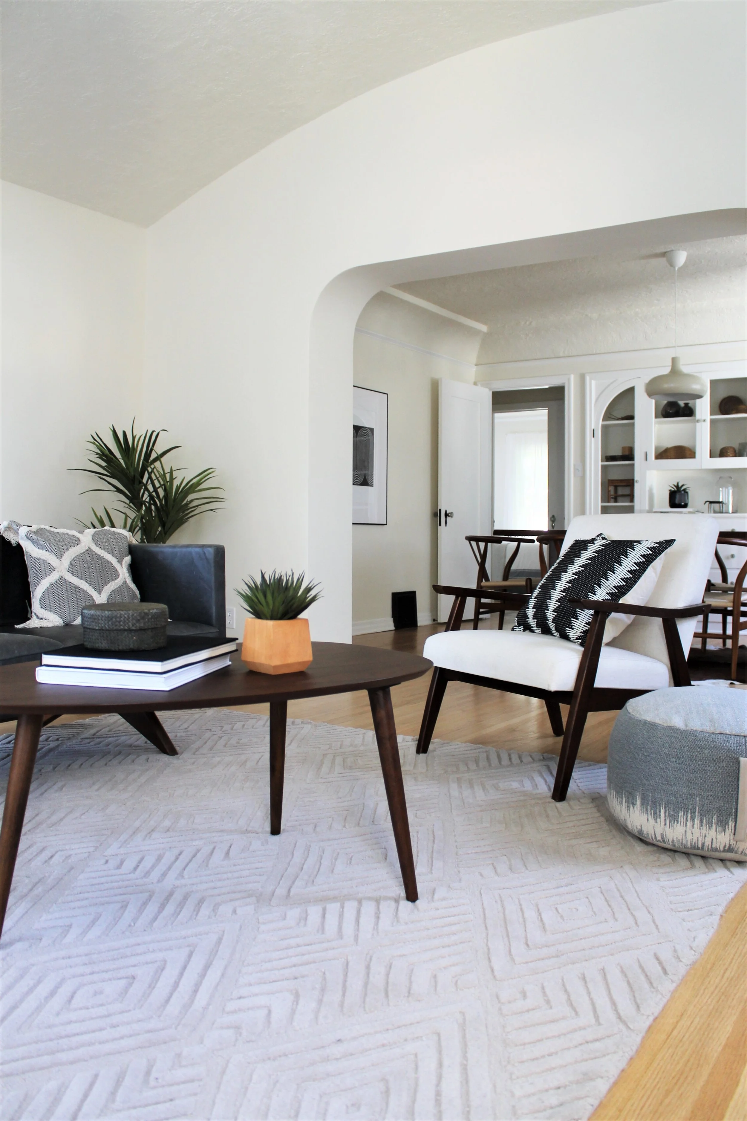 Our client also wanted us to employ our favorite Mid Century modern style as a contrast to the vintage Asian vibe. Here, we brought in a low-slung black leather sofa (the Brooklyn Sofa from West Elm) and accented with strongly patterned B&W art.